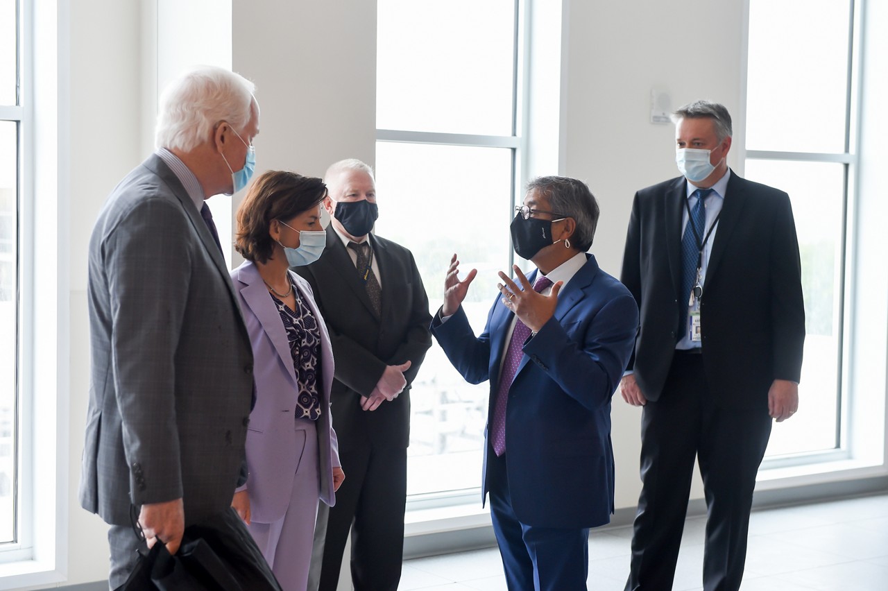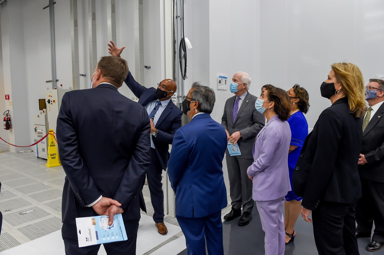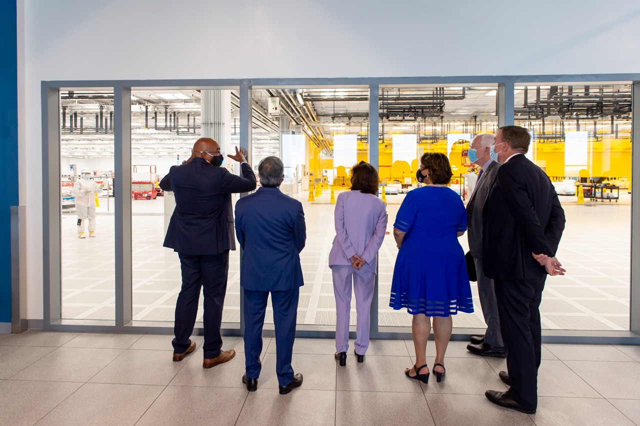 2021 年 5 月 24 日,美光接待了联邦和地方官员等一行人,这些官员均支持有关鼓励投资美国半导体制造和研发的立法。美国商务部长 Gina Raimondo、参议员 John Cornyn 和 Mark Warner 以及 Michelle Davis-Younger 市长等人参观了美光位于弗吉尼亚州马纳萨斯的制造基地,并与美光董事长、总裁兼首席执行官 Sanjay Mehrotra 一起出席了新闻发布会。