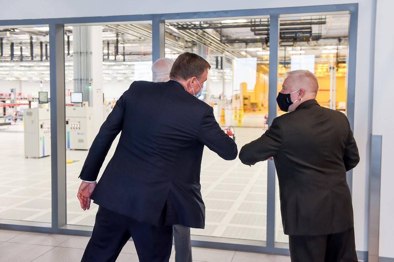2021 年 5 月 24 日,美光接待了联邦和地方官员等一行人,这些官员均支持有关鼓励投资美国半导体制造和研发的立法。美国商务部长 Gina Raimondo、参议员 John Cornyn 和 Mark Warner 以及 Michelle Davis-Younger 市长等人参观了美光位于弗吉尼亚州马纳萨斯的制造基地,并与美光董事长、总裁兼首席执行官 Sanjay Mehrotra 一起出席了新闻发布会。